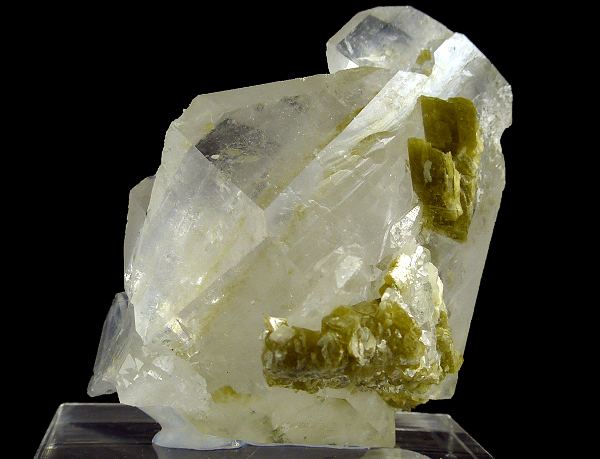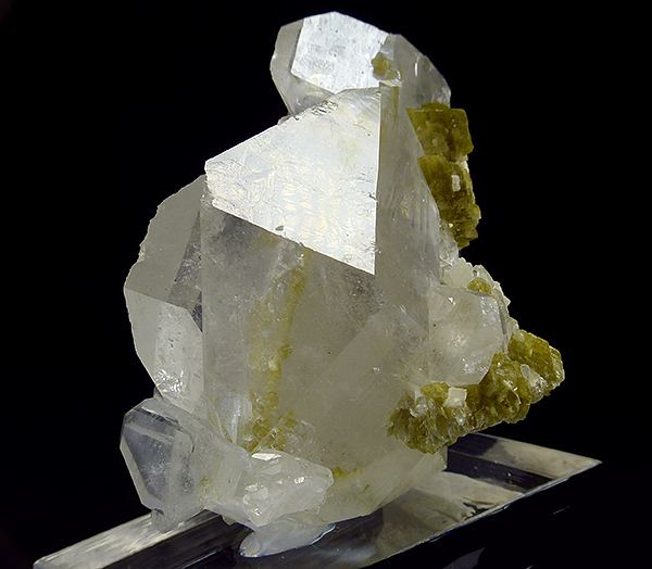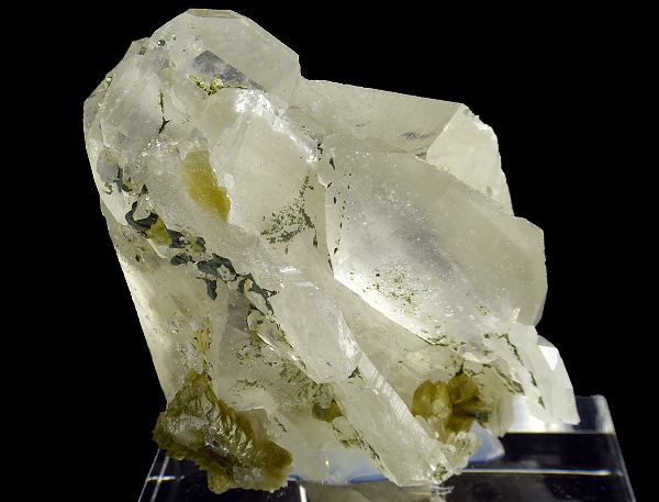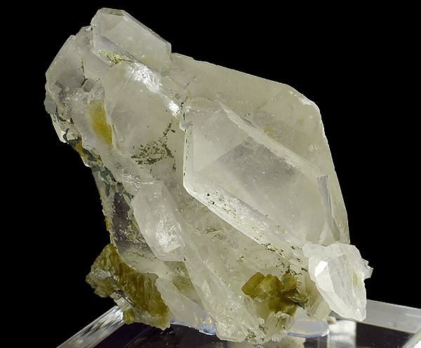 Nice specimen of quartz crystals with parallel growing green siderite, from defunct locality in Morocco. Unusual shape. Specimen mounted to acrylic base. ;Data last checked on 24th Jun 2021 - specimen may no longer be available