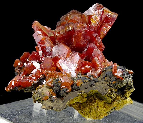 Aesthetic cluster of big, intensively red-orange skeletal crystals of vanadinite on matrix. Good form.Data last checked on 24th Jun 2021 - specimen may no longer be available
