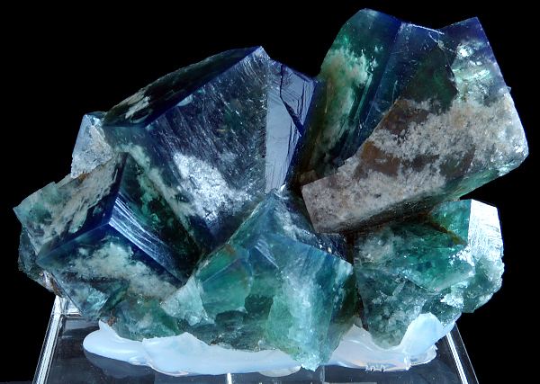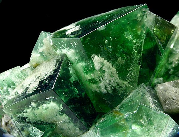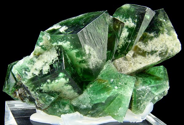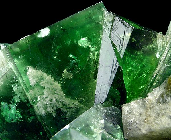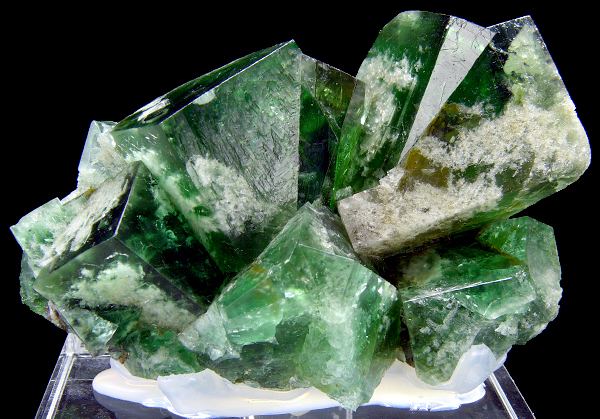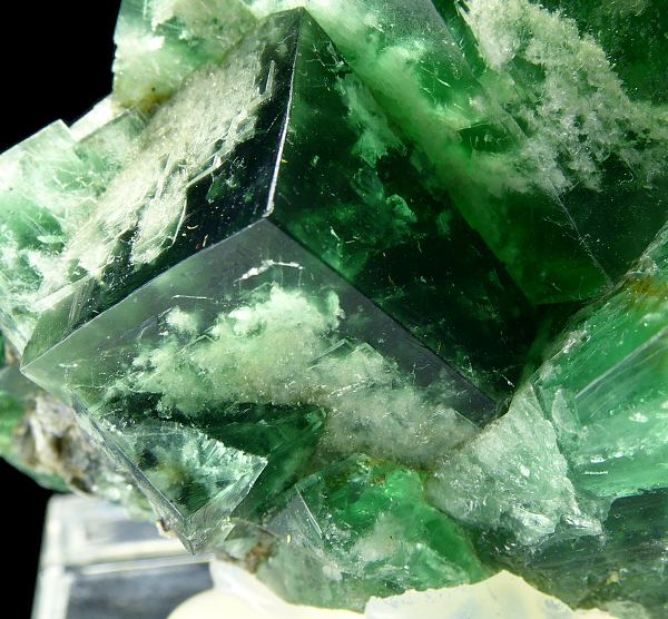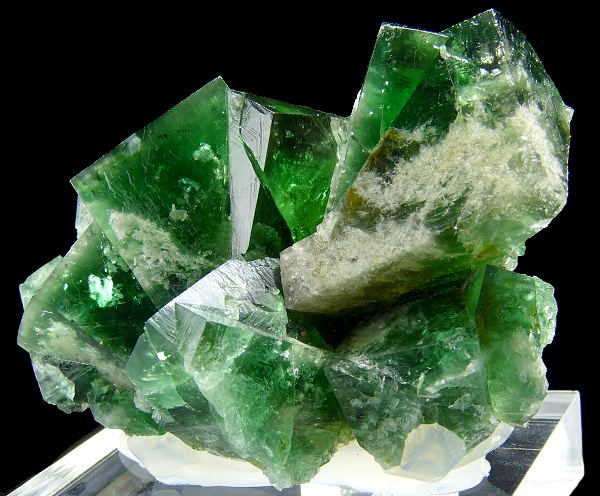 Great specimen with big and sharp fluorite twins perched on the other crystals from world famous locality - Rogerley Mine in UK. Fluorite is showing strong fluorescence in UV light and daylight. Emerald green in incandescent light, blue-green in daylight and electric blue fluorescence in UV light.;Data last checked on 24th Jun 2021 - specimen may no longer be available