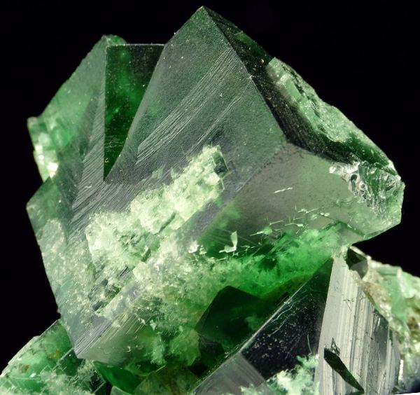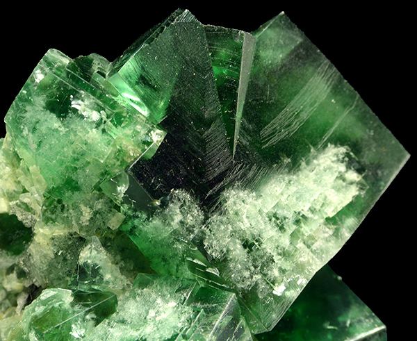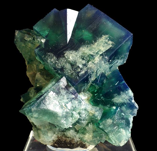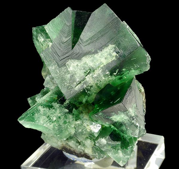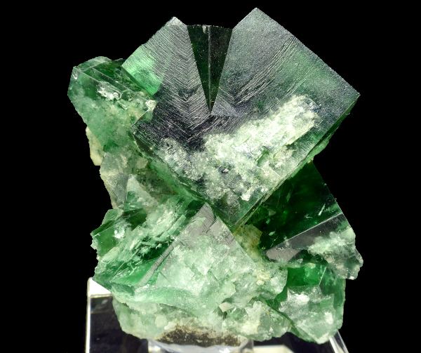 Big, sharp and lustrous fluorite twin perched on other crystals from world famous locality - Rogerley Mine in UK. Fluorite is showing strong fluorescence in UV light and daylight. Emerald green in incandescent light, blue-green in daylight and electric blue fluorescence in UV light.;Data last checked on 24th Jun 2021 - specimen may no longer be available