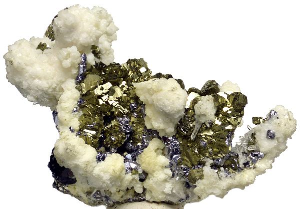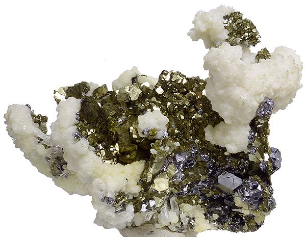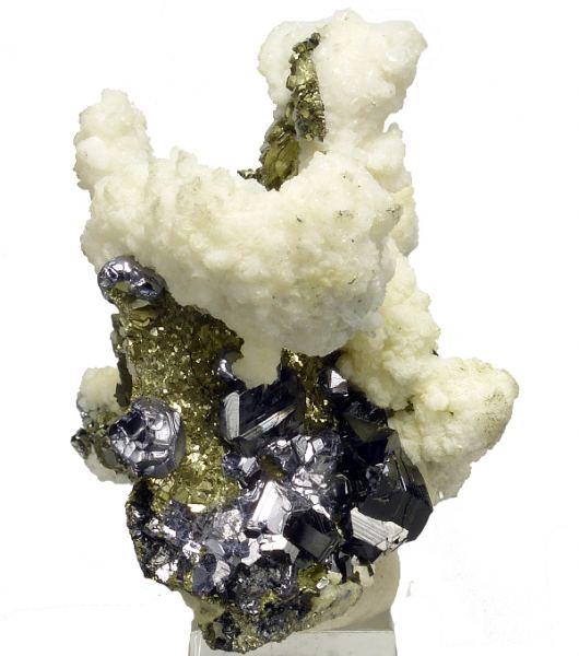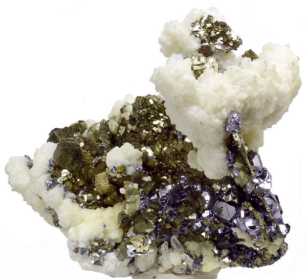 Pyrite pseudomorphose after pyrrhotite, combined with white siderite, lustrous sphalerite and galena. Good form and contrast.;Data last checked on 24th Jun 2021 - specimen may no longer be available