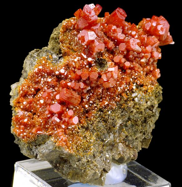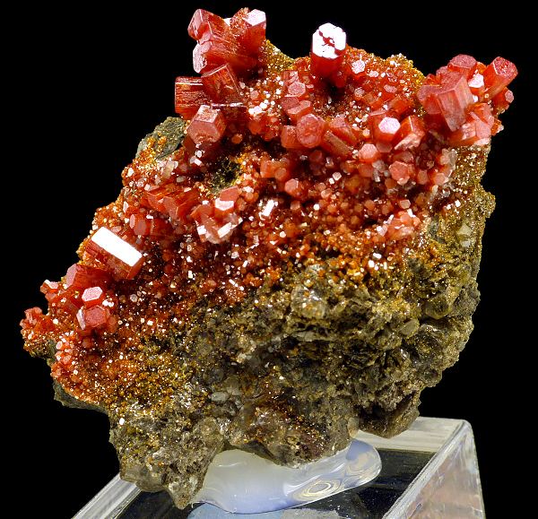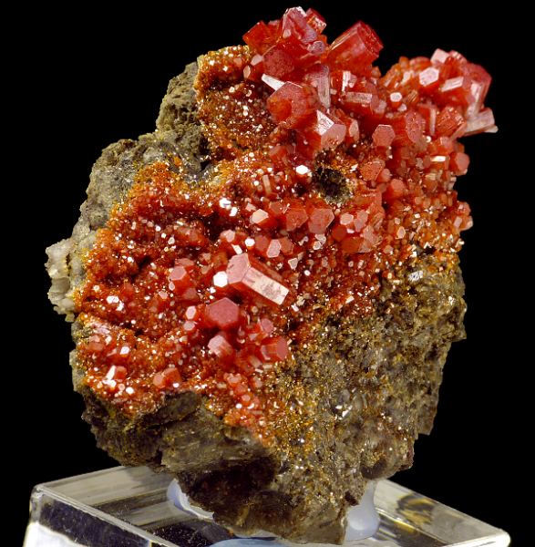 Cluster of lustrous and sharply formed, lustrous, red color crystals of vanadinite on matrix. Good color and luster. Specimen mounted to acrylic base. Arizona classic.;Data last checked on 24th Jun 2021 - specimen may no longer be available