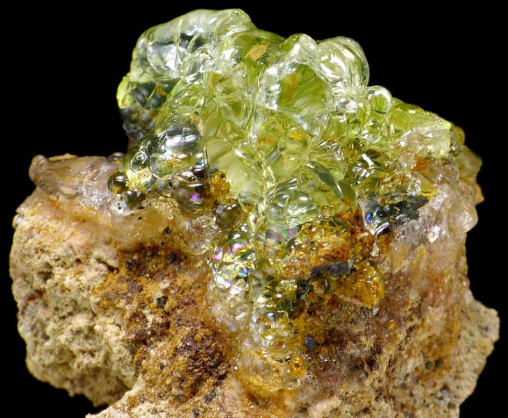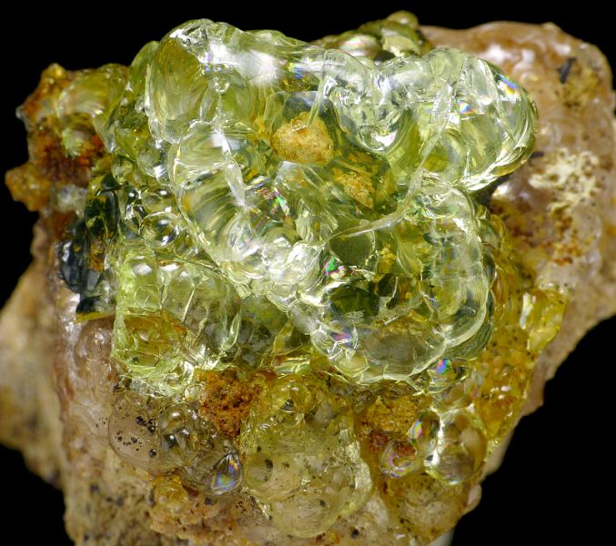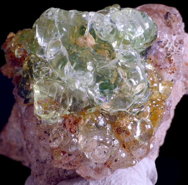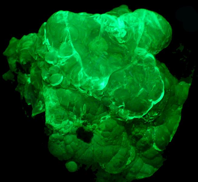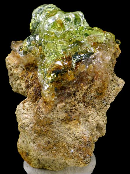 Unusual specimen of transparent botryoidal chalcedony var. hyalite on matrix, with unique daylight (daylight, LED and neon light) fluorescence in intense green color. This piece have the strongest daylight fluorescence possible from the find! In artificial light (incandescent) hyalite became amost colorless, and in UV light it is crazy neon-green. Fluorescence is caused by small uranium content. Cutting quality material. This type of hyalites are known from this only locality in the world. Great 3D form and luster! Very aesthetic & spectacular!Data last checked on 24th Jun 2021 - specimen may no longer be available