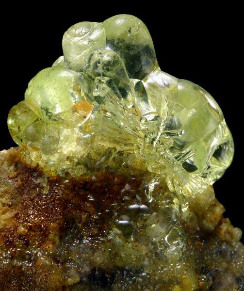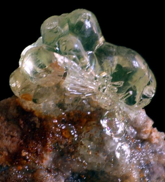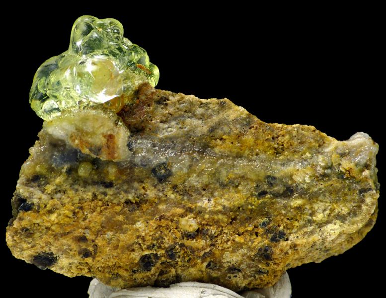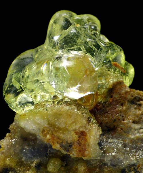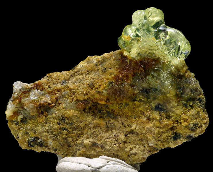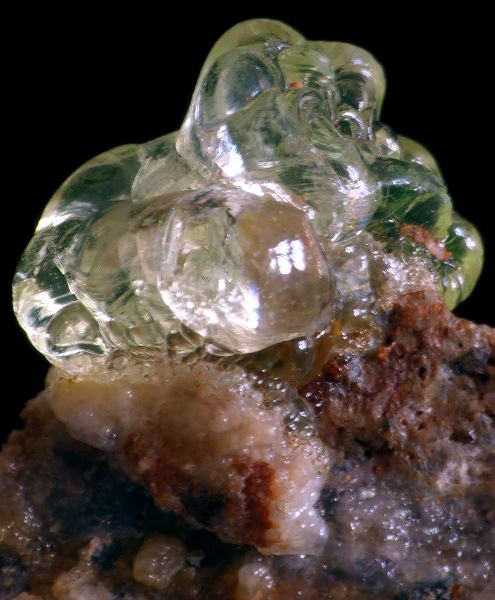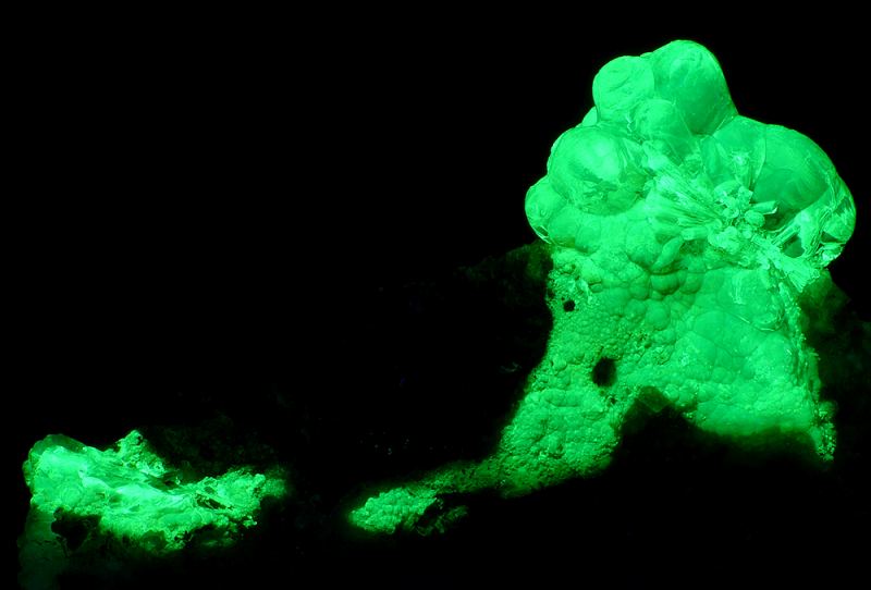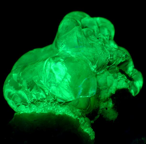 Unusual specimen of transparent botryoidal chalcedony var. hyalite on matrix, with unique daylight (daylight, LED and neon light) fluorescence in intense green color. This piece have the strongest daylight fluorescence possible from the find! In artificial light (incandescent) hyalite became amost colorless, and in UV light it is crazy neon-green. Fluorescence is caused by small uranium content. Cutting quality material. This type of hyalites are known from this only locality in the world.Data last checked on 24th Jun 2021 - specimen may no longer be available