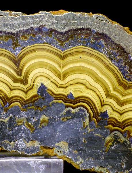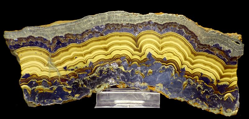 Polished slab of a "schalenblende" – consisting of alternating bands of brown-yellow sphalerite, silver and lustrous galena and marcasite. Good pattern. Fluorescent under UV light.Data last checked on 24th Jun 2021 - specimen may no longer be available