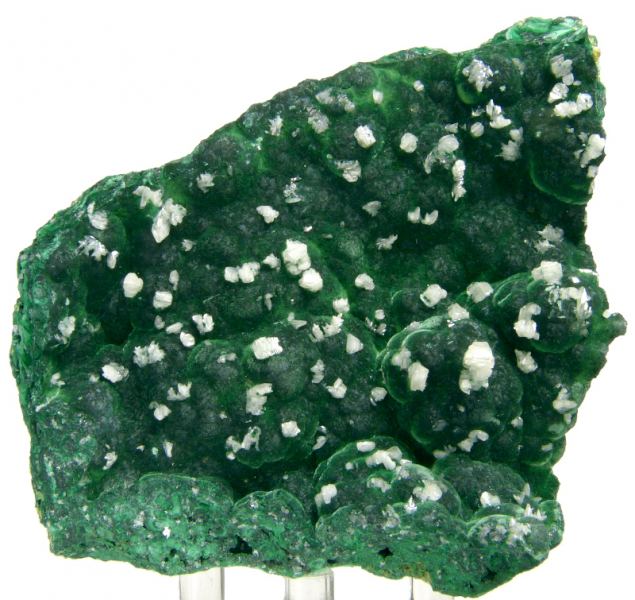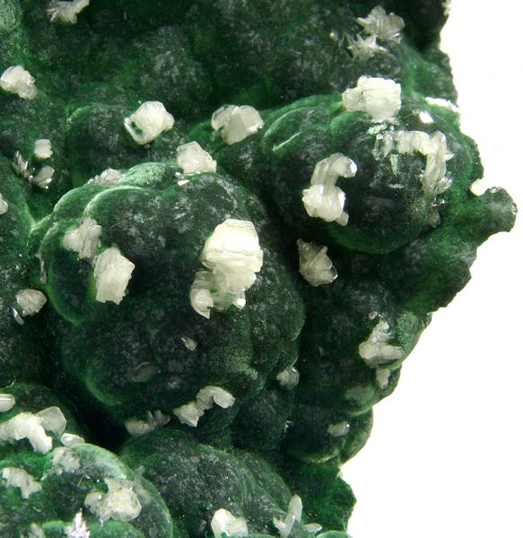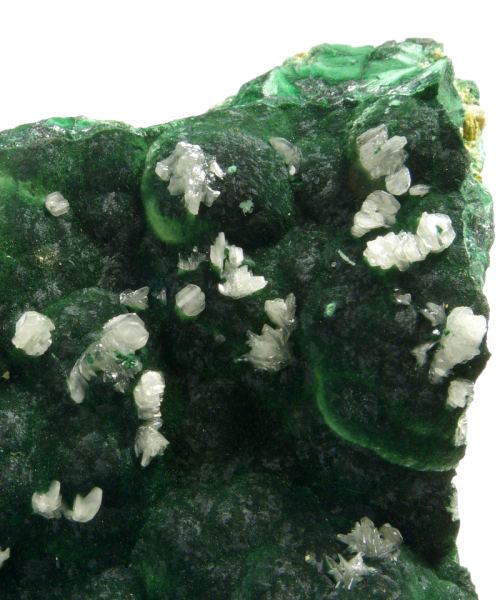 Unusual combo of white "snowflakes" cerussite crystals on contrastive, dark green "bubbly" malachite matrix. Great color and top contrast! ;Data last checked on 24th Jun 2021 - specimen may no longer be available