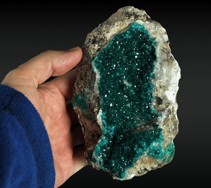 This is a large dramatic example of Dioptase. It exhibits the best color from Kazakhstan, a rich emerald green. The dioptase from here is typically formed in seams within the host rock, and the crystals are commonly small, but intensely brilliant. 972 grams/ over 2 pounds. (I'm not quiting my day job to become a hand model, it just helps to know how large this piece is).Data last checked on 25th Jun 2021 - specimen may no longer be available