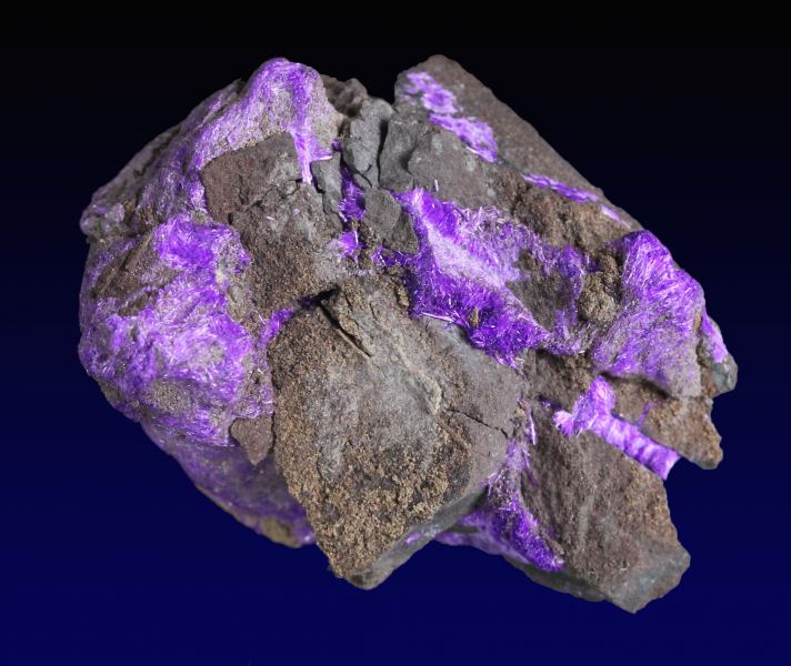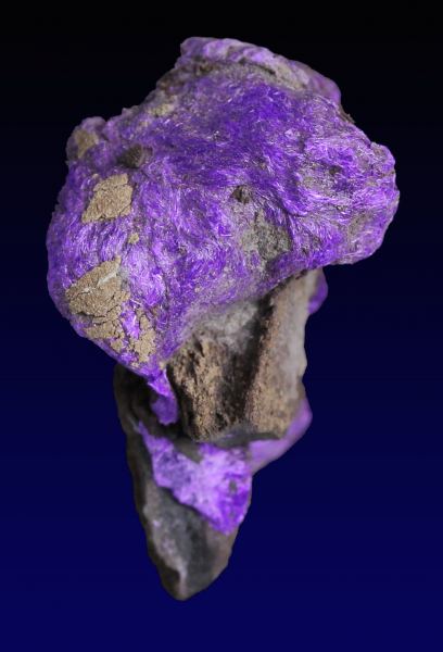 Within the last 2 years, a small pocket of crystallized Sugilite was found at the N'Chwanning III mine. Sugilite is typically found at the Wessels mine, in solid chunks, so this was an amazing discovery. Fibrous purple crystals grow in the seams of the Aegerine matrix. The Sugilite is an electric purple (daylight) that shifts to an electric magenta under incandescent light. A fine piece, with lots of color for its size. No damage. Data last checked on 25th Jun 2021 - specimen may no longer be available