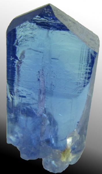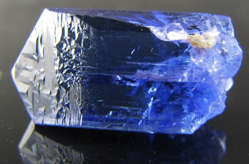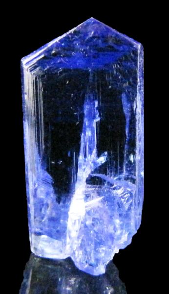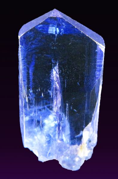 Tanzanite is a gem form of zoisite, found only in the Arusha region of Tanzania. Mining is very deep, as gemstones easily go for $250 - $1000+ per carat. Crystals are also produced, of varying quality given largely that anything with a gemmy area within it gets cut. Also most are dinged, so getting pristine specimens is very difficult. Most pieces are heat treated, which mimics the natural geology that gives the crystals that amazing blue-purple color. The mines are incredibly deep and long term future production is in question.It weighs 21.37 carats (4.27 grams). It is a vibrant blue-purple with remarkable gemminess through out. The termination is pristine. The side near the bottom has a slight sheered spot that under the microscope is a crystallied face, so this happened while in the pocket and still growing.(it's very hard to spot) The main front face has some raised triangles (known as screw distortions to geologists), overall a great crystal, with flashes of purple when looking at it from the side.