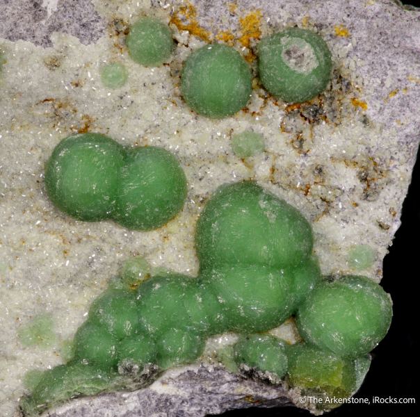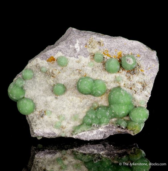 This is a Wavellite from Mauldin Mountain, Montgomery Co., Arkansas, USA. Uncommon style showing discrete individual Wavelite spheres across a sparkling layer of microcrystalline Calcite on gray matrix.Data last checked on 29th Jul 2024 - specimen may no longer be available