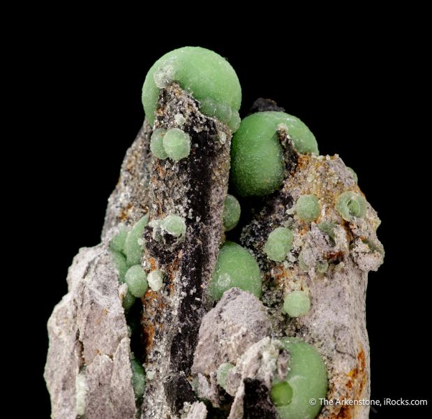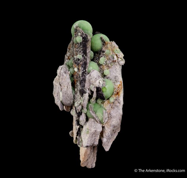 This is a Wavellite from Mauldin Mountain, Montgomery Co., Arkansas, USA. Highly dramatic 360 degree display of large lime green Wavellite spheres delicately perched on top and running down an open fractured chert matrix.Data last checked on 29th Jul 2024 - specimen may no longer be available