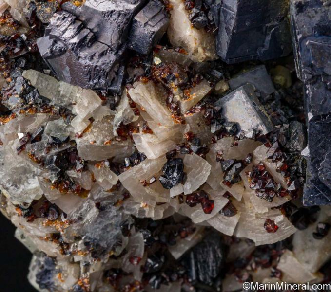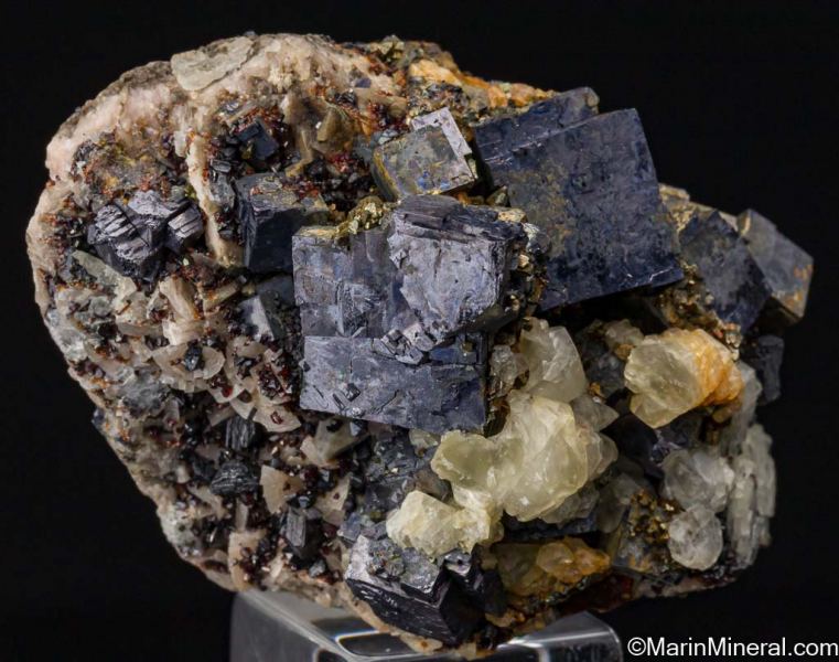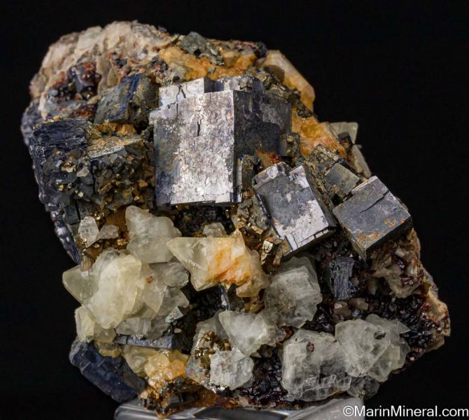 Bright metallic Galena cubes to 2.5cm on a silicified limestone matrix with red 'Ruby-Jack' Sphalerite crystals, Dolomite, and Calcite crystals from Treece, Kansas. The Galena are present on one side, but the specimen detached in the pocket and the Sphalerite and Calcite are present on all sides, making this a floater.Data last checked on 25th Jun 2021 - specimen may no longer be available