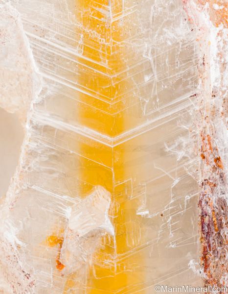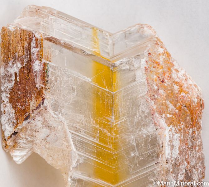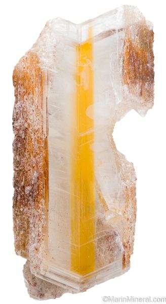 Large, water-clear single Selenite crystal with a distinctive yellow strip running down the center. The Selenite shows 'fish tail' twinning and has another smaller included Selenite crystal.Data last checked on 25th Jun 2021 - specimen may no longer be available