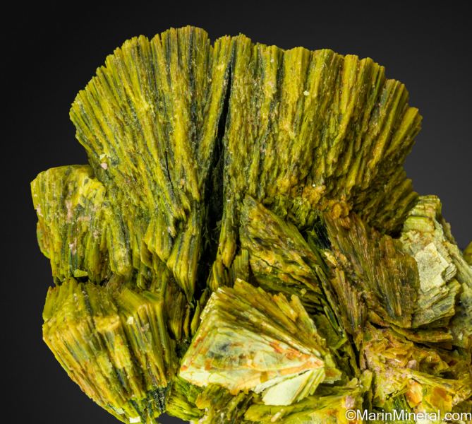 Good sized specimen of solid Autunite with a bright green-yellow coloration. The crystals form thick clusters or 'books' representative of the mine.Data last checked on 25th Jun 2021 - specimen may no longer be available
