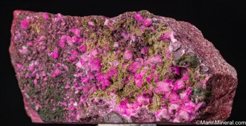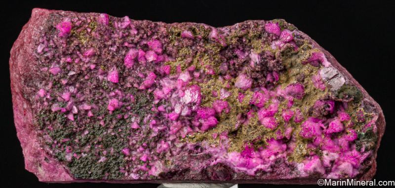 Dark olive green to yellowish green Kolwezite atop vivid pink Cobaltoan Calcite. Kolwezite is a Copper Cobalt Carbonate Hydroxide and this is the type locality for the species. A beautiful large display piece and combination specimen of two desireable species together. Sawcut on back.Data last checked on 25th Jun 2021 - specimen may no longer be available