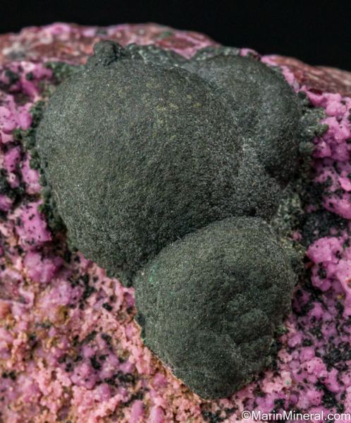 Dark olive green botryoidal Kolwezite atop rhombs of pink Cobaltoan Calcite (or possibly Cobaltoan Dolomite) creating a stunning mixture of colors and forms. Kolwezite is a Copper Cobalt Carbonate Hydroxide and this is the type locality for the species. A beautiful display piece and combination specimen of two desireable species together. Sawcut on back.Data last checked on 25th Jun 2021 - specimen may no longer be available
