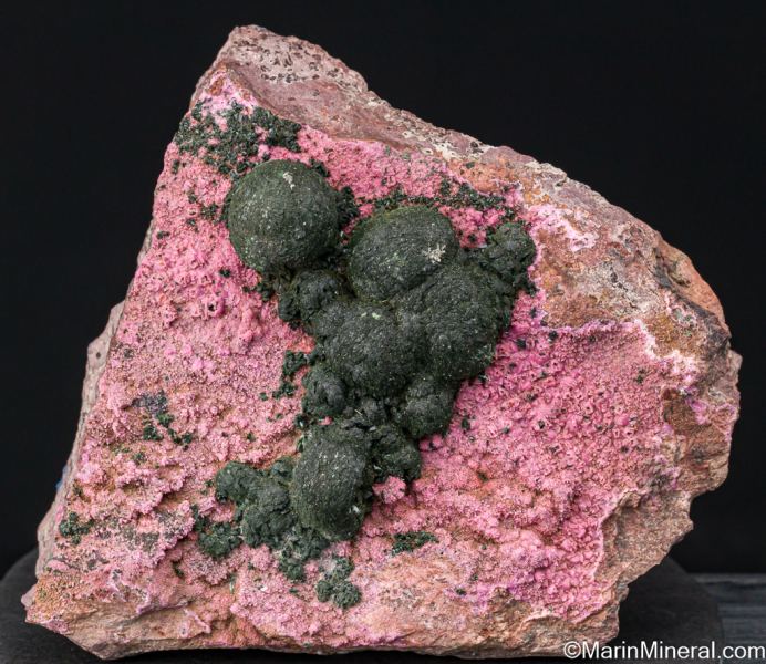 Dark olive green botryoidal Kolwezite atop rhombs of pink Cobaltoan Calcite (or possibly Cobaltoan Dolomite) creating a stunning mixture of colors and forms. Kolwezite is a Copper Cobalt Carbonate Hydroxide and this is the type locality for the species. A beautiful large display piece and combination specimen of two desireable species together. Sawcut on back.Data last checked on 25th Jun 2021 - specimen may no longer be available