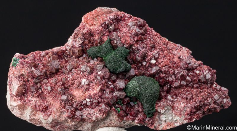 Dark green crystal groups of Malachite or Kolwezite atop deep red Cobaltoan Calcite (or possibly Cobaltoan Dolomite) creating a stunning mixture of colors and forms. Kolwezite is a Copper Cobalt Carbonate Hydroxide and this is the type locality for the species. A beautiful, colorful display piece. Sawcut on back.Data last checked on 25th Jun 2021 - specimen may no longer be available
