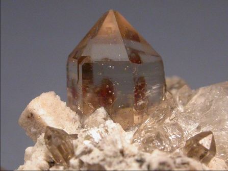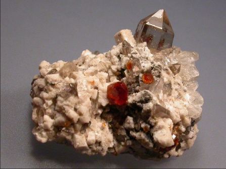 Pretty specimen with a prominent transparent and slightly smokey quartz crystal, a few deep reddish orange spessartine crystals 0.5-3mm, smaller quartz crystals and white orthoclase. Small but pleasing, no damage to the main crystals.Data last checked on 11th Aug 2021 - specimen may no longer be available