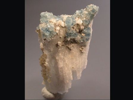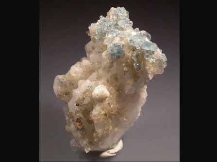 Delicate blue zoned apatite crystals to 3mm with translucent yellow muscovite on albite. Also white microcrystalline aggregates that are probably bertrandite but this has not been confirmed. Minor chips to apatite visible with hand lens but a pretty and interesting specimen. Apatite fluoresces yellow under SW UV.Data last checked on 11th Aug 2021 - specimen may no longer be available