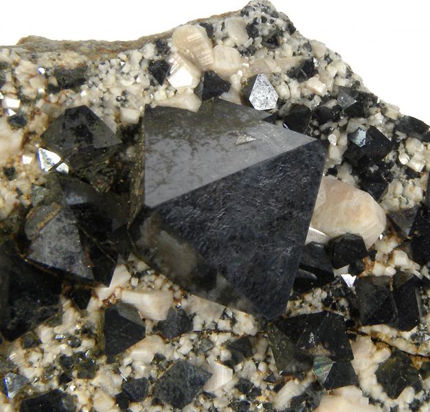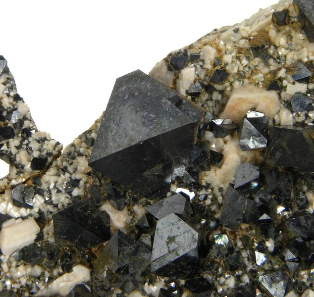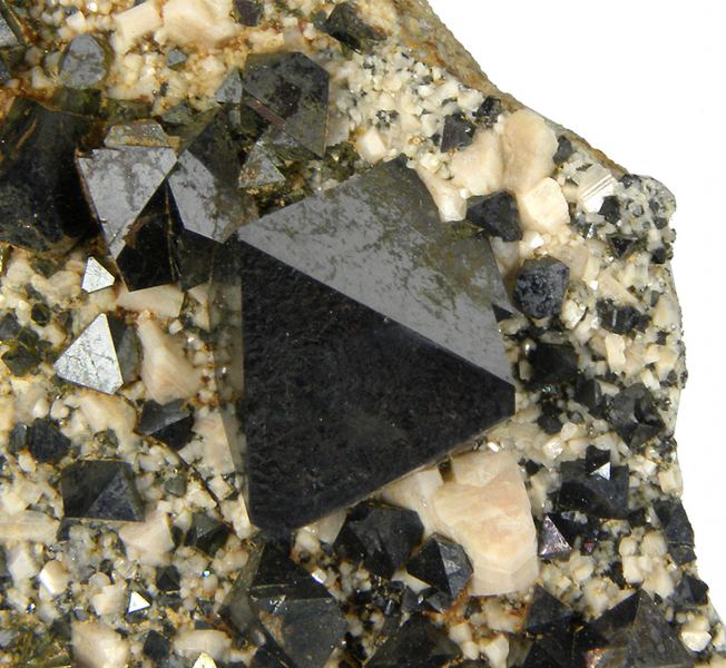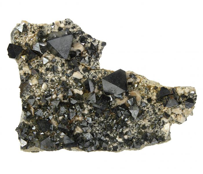 Typically the Magnetite specimens from this locality are closely grown together, but this one does have decent isolation between the crystals. The piece has fine, sharp, lustrous, black, metallic, Alpine-type octahedra (some are twinned) associated with cream colored Feldspar on matrix. Great qualiData last checked on 23rd Aug 2021 - specimen may no longer be available
