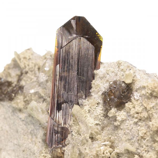 This aesthetic specimen features the largest individual crystal of Brookite on any piece in the update, measuring a full 3.2 cm long! These crystals are very sharp, lustrous and well-formed with classic sword-shaped pyramidal terminations. You can see a bit of a golden hue on the edges when the cryData last checked on 23rd Aug 2021 - specimen may no longer be available