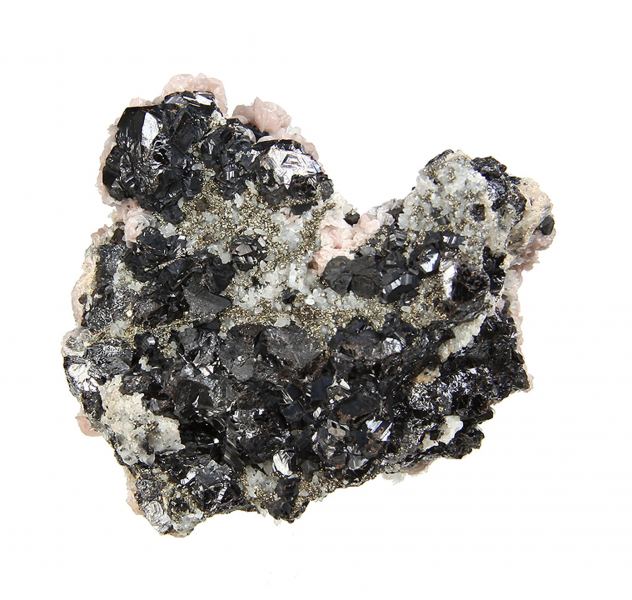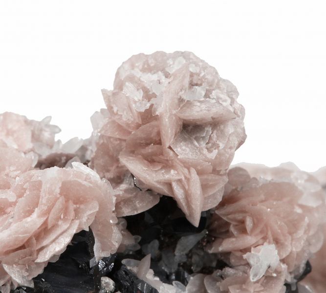 Dozens of soft pink colored “rosettes” comprising compressed rhombohedra or “discs” of Rhodochrosite are intergrown with beautiful white Quartz crystals and gently sprinkled atop contrasting black Sphalerite matrix to make this small cabinet display specimen a great representation of the maData last checked on 23rd Aug 2021 - specimen may no longer be available