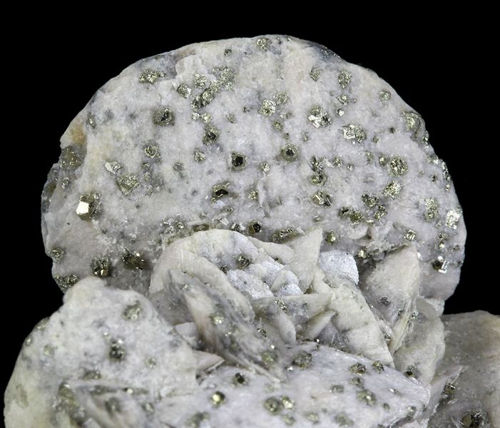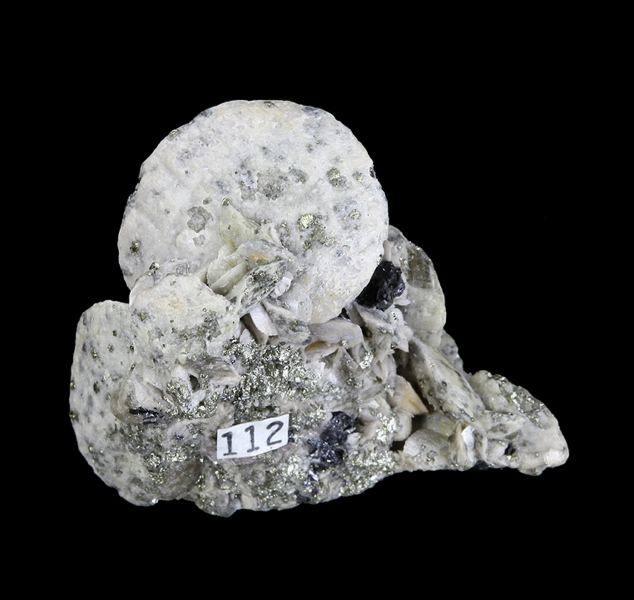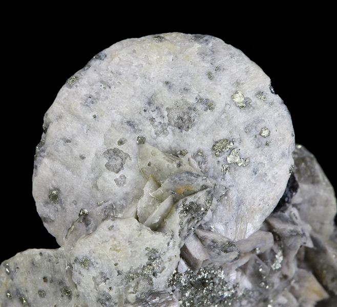 A beautiful cream-beige colored compressed rhomb or “disc” of Siderite proudly sits atop a mound of smaller Siderite crystals which are adorned by small, sparkling Pyrite crystals. The Siderites from this mine are not the typical blocky rhombic habit like those seen from a lot of other ore bodiData last checked on 23rd Aug 2021 - specimen may no longer be available