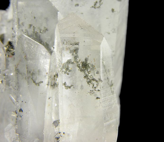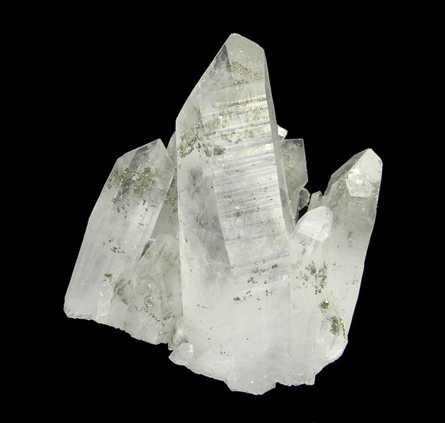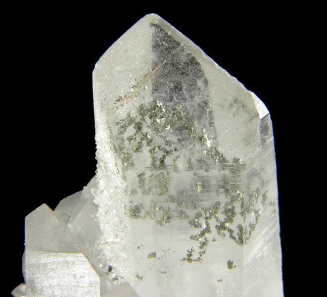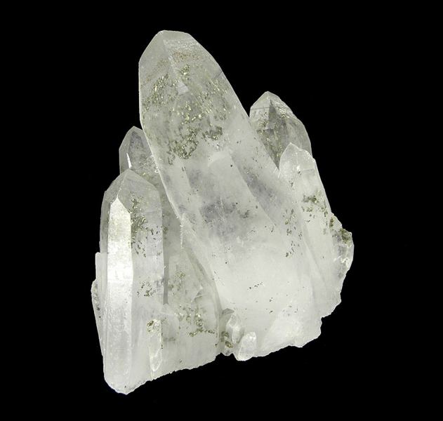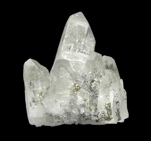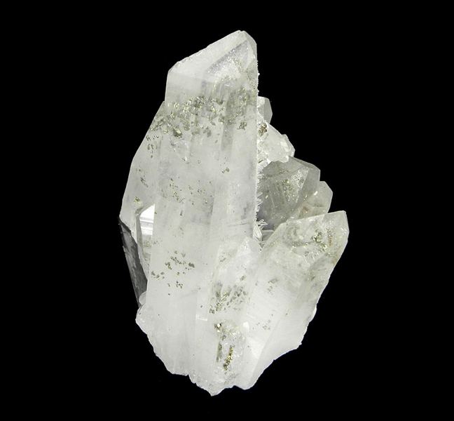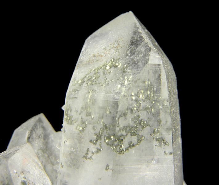 An aesthetic group of very gemmy, colorless prismatic Quartz crystals which are included unique and eye-catching “phantoms” of metallic golden Pyrite floating near the terminations of the crystals. The reverse side of the specimen shows that the Pyrite is not only growing inside the Quartz crysData last checked on 23rd Aug 2021 - specimen may no longer be available