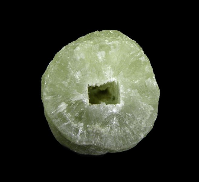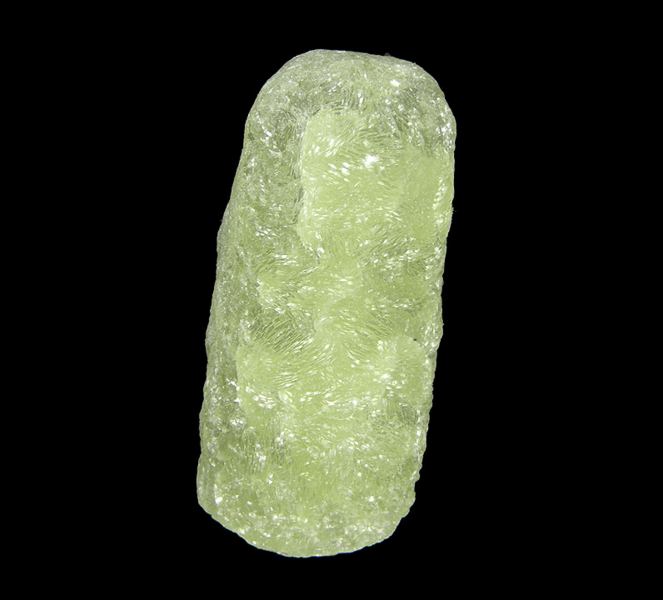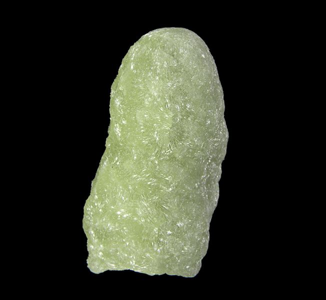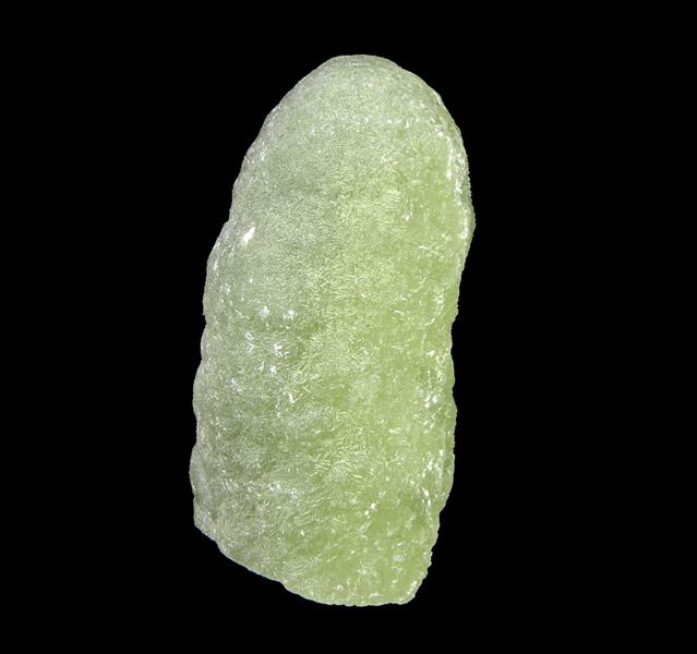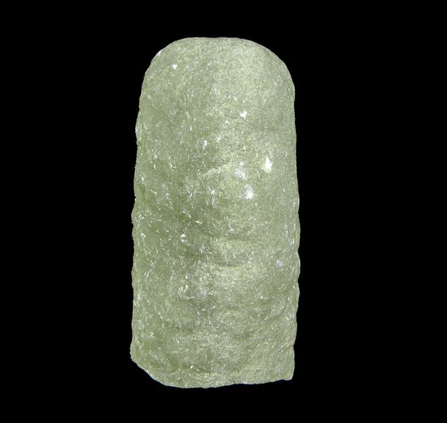 A classic, single finger-shaped cast of Prehnite after Anhydrite with good luster on the display side, and a slight coating of a secondary clay mineral on the back. The underside of the piece shows the square cross-section of the once preexisting Anhydrite crystal that was the base for the cast.LocData last checked on 23rd Aug 2021 - specimen may no longer be available