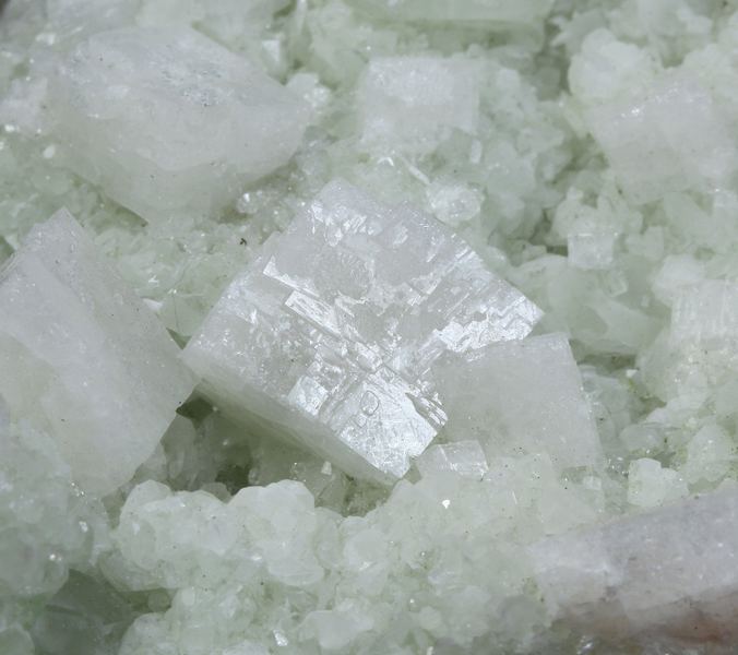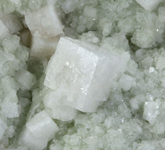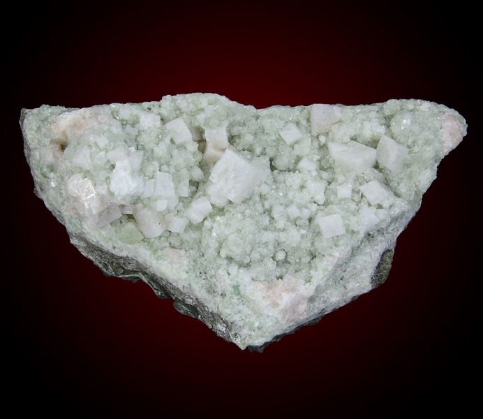 This specimen features several sharp, lustrous, pearly, pseudo-rhombohedra of Chabazite associated with green Prehnite on basalt matrix. The Chabazites are mostly white, but they do have a faint peach-pink color in areas, which is rare in my experience with this material.The quarry at Upper New StrData last checked on 23rd Aug 2021 - specimen may no longer be available