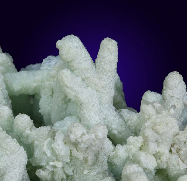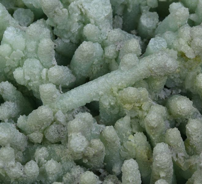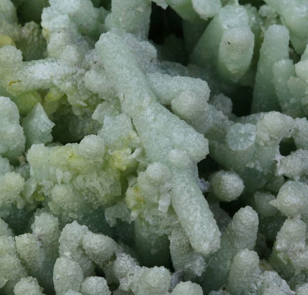 One of the most unusual Prehnites I have seen from any locality. At first glance, one might think that these are casts or epimorphs after another species, as Prehnite has been known to do, but upon close inspection you can see that these are completely solid inside, and are basically Prehnite stalaData last checked on 23rd Aug 2021 - specimen may no longer be available