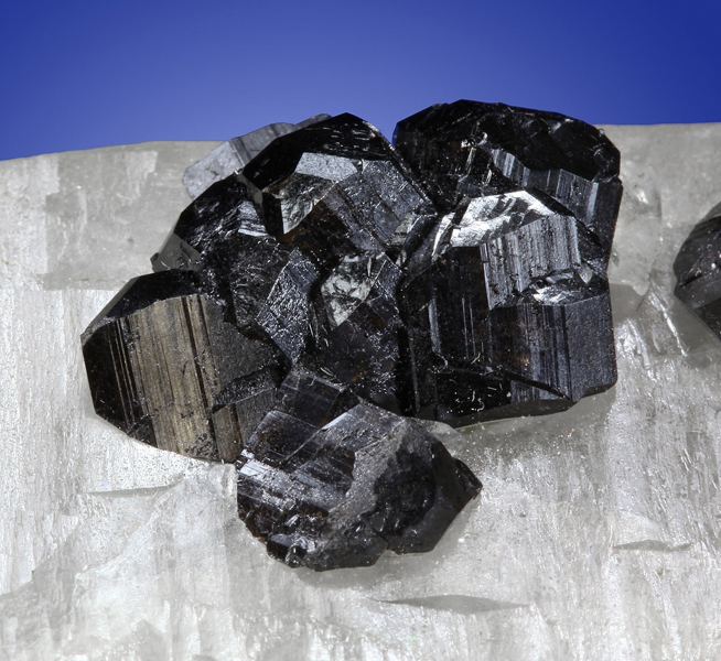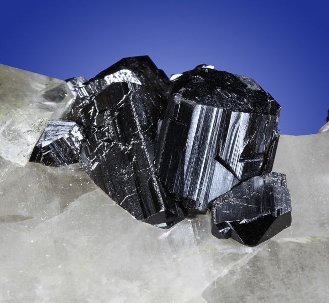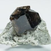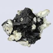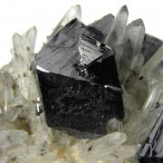 A fairly large and hefty, doubly-terminated, slightly “smoky” Quartz crystal group plays host to several sharp, lustrous, mostly black, well-formed, prismatic tetragonal Cassiterite crystals (some of which have formed “drill bit” twins) which are dotted along the prism of the Quartz. This iData last checked on 23rd Aug 2021 - specimen may no longer be available