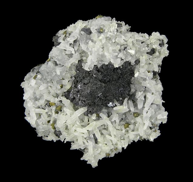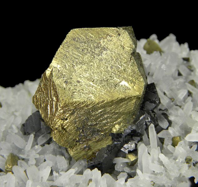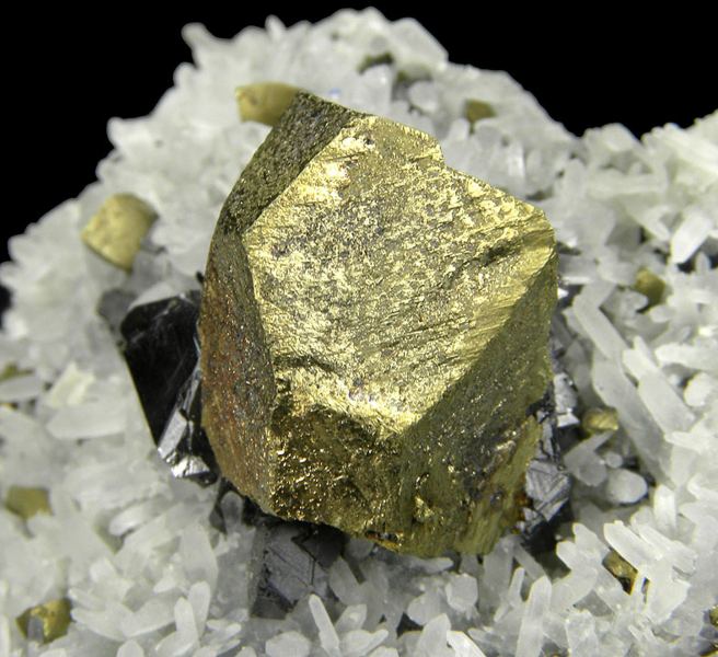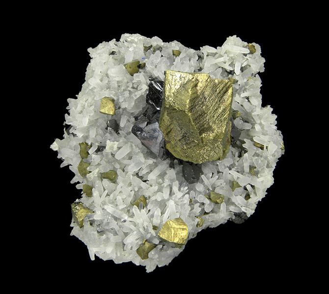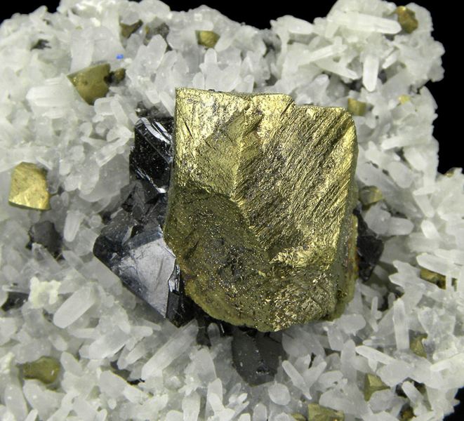A predominant, undamaged, golden tetragonal scalenohedron of Chalcopyrite sits in the center of a plate of grey-white Quartz “needles”. The piece is accented by sharp, lustrous black Sphalerite crystals and additional Chalcopyrites which are sprinkled throughout. A very attractive miniature sizData last checked on 23rd Aug 2021 - specimen may no longer be available