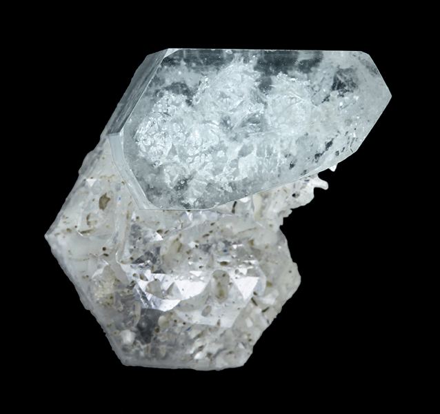 A very unusual and interesting thumbnail specimen from Pakistan. The piece was very difficult to photograph, and it best appreciated in person, as it has such a complex growth with a simple sharp, highly lustrous, GEM quality, light blue prismatic termination that is sitting atop a prism with an unData last checked on 23rd Aug 2021 - specimen may no longer be available