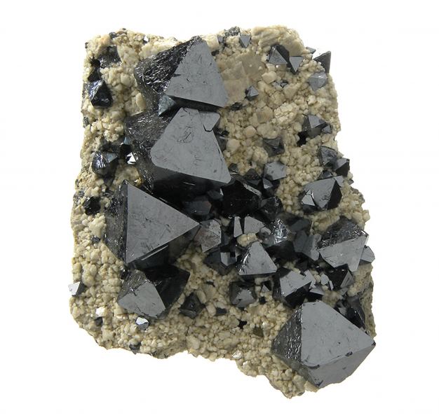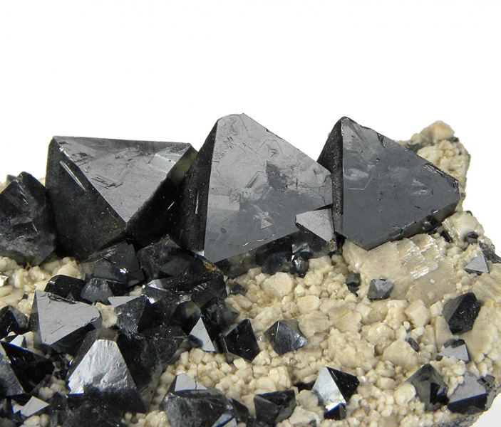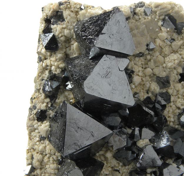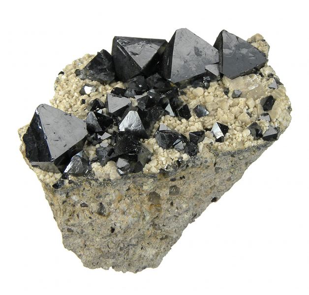 Typically the Magnetite specimens from this locality are closely grown together, but this one does have decent isolation between the crystals. The piece has fine, sharp, lustrous, black, metallic, Alpine-type octahedra (some are twinned) associated with cream colored Feldspar on matrix. Great qualiData last checked on 23rd Aug 2021 - specimen may no longer be available