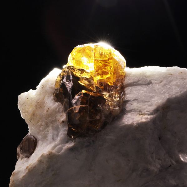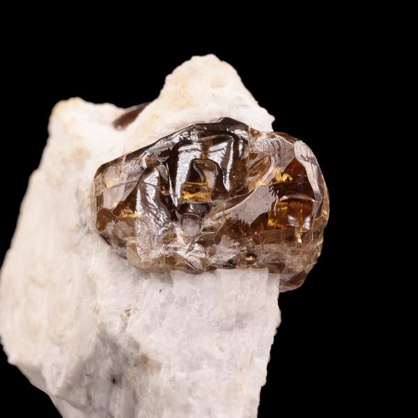 Zircon crystals are not terribly common from around Mogok, but to find crystals on matrix is exceedingly rare in my experience. This attractive miniature display specimen features a few gemmy, rich golden-brown colored Zircon crystals measuring up to 1.7 cm sitting on fine-grained off-white FeldspData last checked on 23rd Aug 2021 - specimen may no longer be available