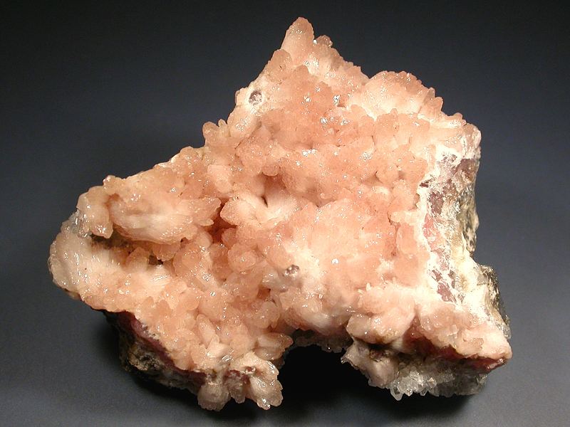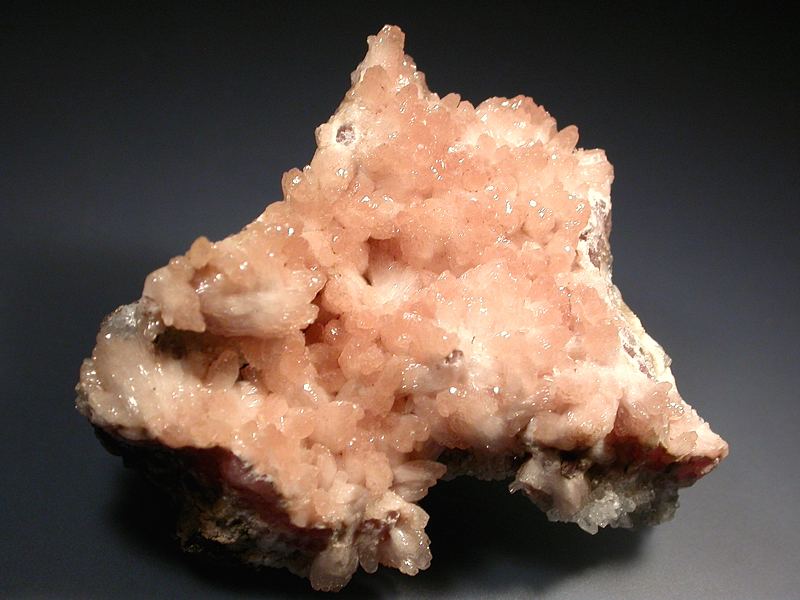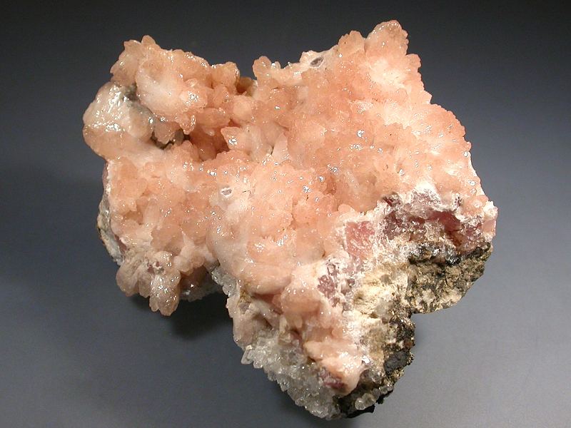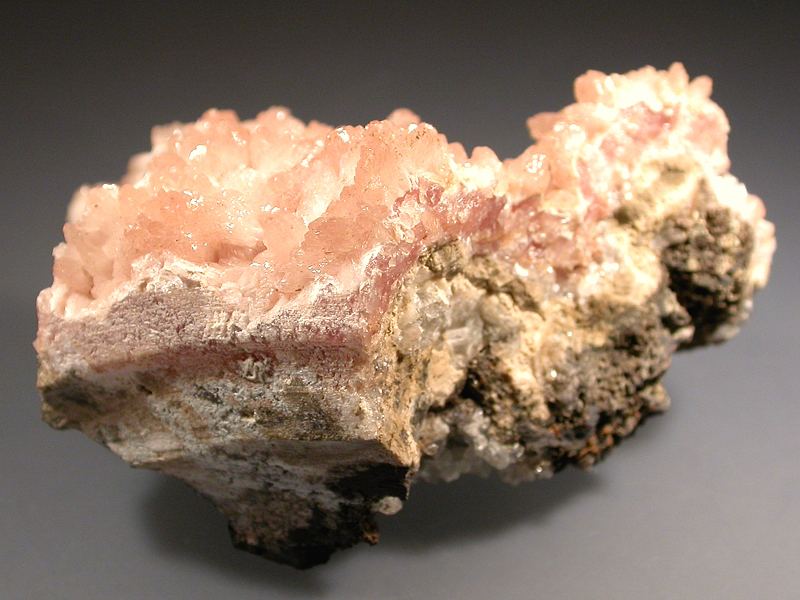 The top of the specimen is covered in lustrous and zoned olmiite crystals up to 10mm, a couple are damaged but most are in perfect condition. Contact areas around the edge and one sawn surface at the back which can not be seen form the main display angle. Good sized attractive specimen from the type locality.Data last checked on 11th Aug 2021 - specimen may no longer be available
