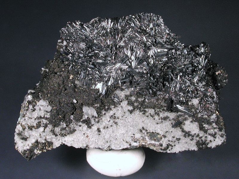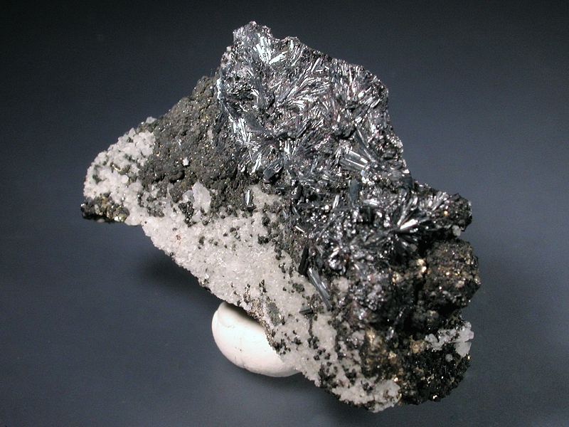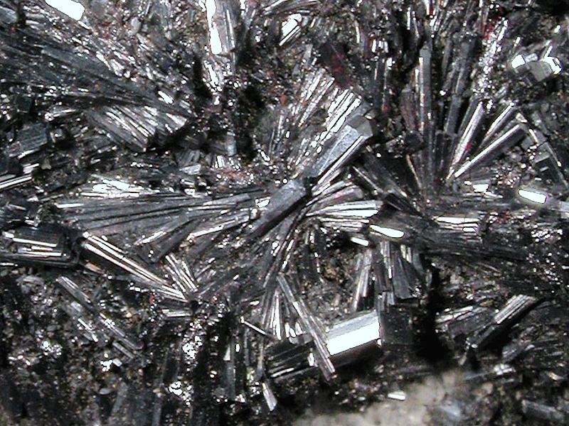 Fanning, lustrous hutchinsonite crystals mostly 2-3mm long with a deep red colour richly cover the top front part of the specimen. Associated with an unidentified microcrystalline grey-black phase on a quartz-pyrite rich matrix. Rich example of hutchinsonite, a rare thallium sulphosalt.Data last checked on 11th Aug 2021 - specimen may no longer be available