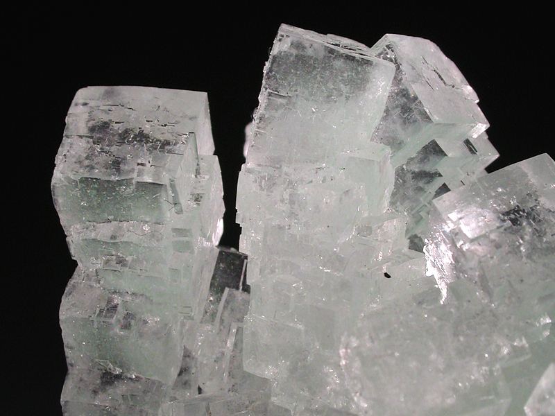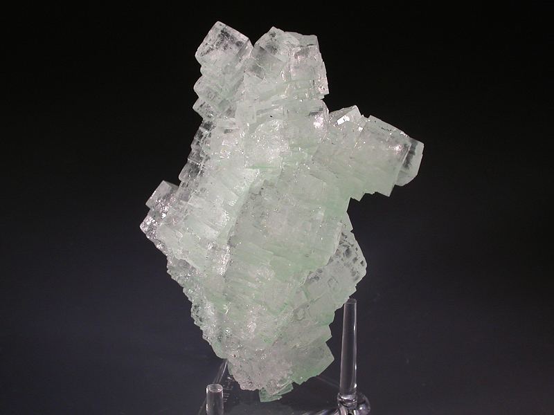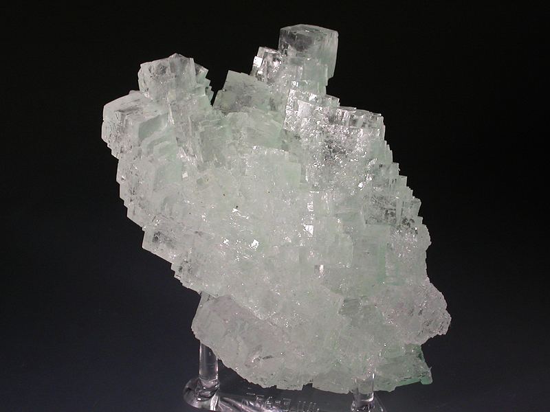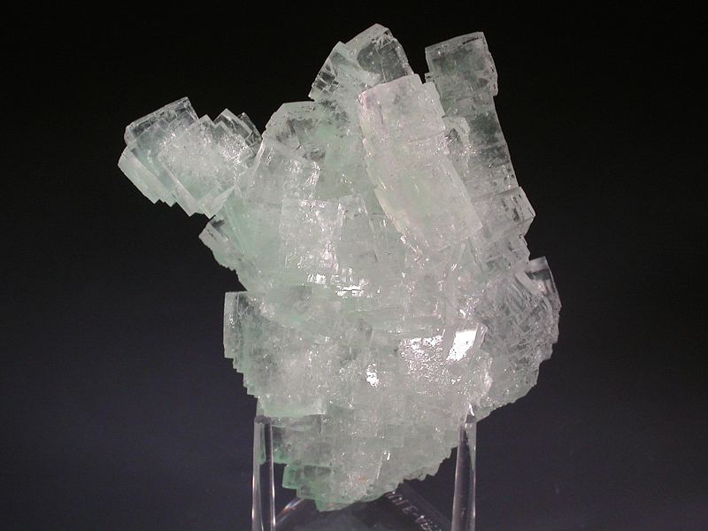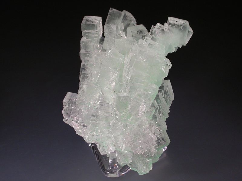 Transparent halite cubes up to 1.3cm across which are stacked to give columnar-like structures. The halite is coloured green by a dusting of a copper mineral (?atacamite) mainly towards the base of the specimen. No significant damage, a few minor chips and scuffs to crystal corners are visible with a hand lens. Unusual and displays beautifully. Fluoresces bright orange under SW UV. From a new find in 2016. Note that halite is water soluble.Data last checked on 11th Aug 2021 - specimen may no longer be available