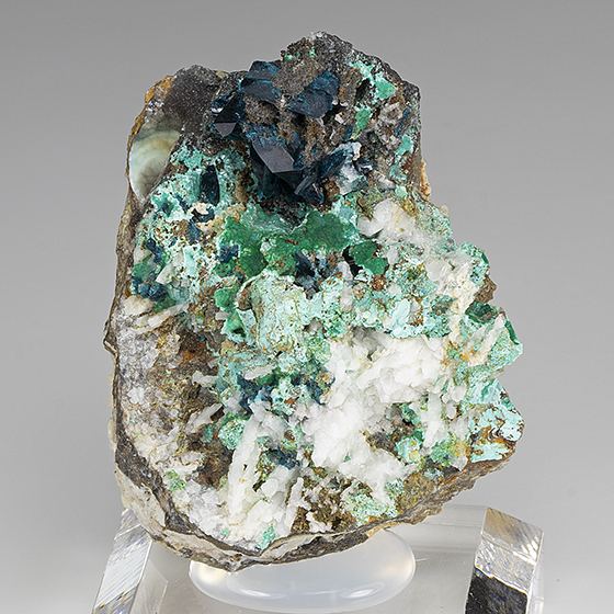 Lustrous deep blue crystals of veszelyite to 0.5 cm in size on matrix with crystallized theisite and hemimorphite. In good condition and it excellent combination piece for this rare species.Data last checked on 11th Aug 2021 - specimen may no longer be available