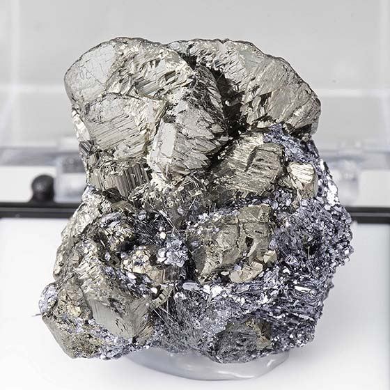 Exceptional bright lustrous crystals of stannite to 1.3 cm in size on galena. In great condition. The identity has been confirmed. Mounted for display in a perky box and will ship as shown.Data last checked on 11th Aug 2021 - specimen may no longer be available