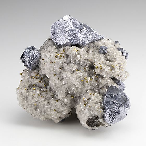 Lustrous sharp octahedral crystals of galena to 2.3 cm in size on a matrix of sparkling white crystallized dolomite with small golden chalcopyrite crystals. In great condition. Very good example for this crystal habit for the species from this mining district.Data last checked on 11th Aug 2021 - specimen may no longer be available