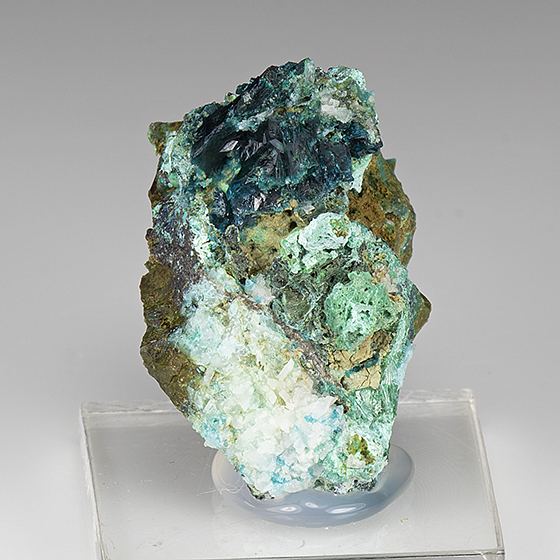 Neat combination piece showing crystals of deep blue veszelyite to 0.5 cm in size on matrix with light blue crystallized theisite. In good condition, neat combination piece for this rare species. From recent finds.Data last checked on 11th Aug 2021 - specimen may no longer be available
