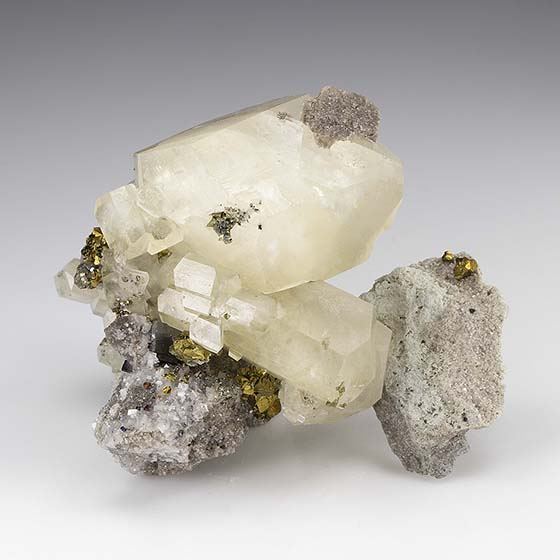 Interesting grouping of pale yellow translucent calcite crystals on breccia matrix with chalcopyrite. Very distinctive crystallization, I remember this pocket from very late in 1990. There were not a lot of specimens recovered.Data last checked on 11th Aug 2021 - specimen may no longer be available
