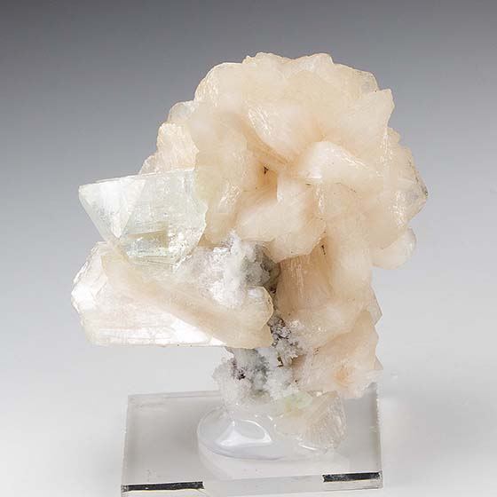 Lustrous crystals of stilbite to 3.5 cm in length and a matrix less cluster with a gemmy crystal of apophyllite 2.0 cm in size. The apophyllite crystal is cleaved. The stilbite in great condition.Data last checked on 11th Aug 2021 - specimen may no longer be available