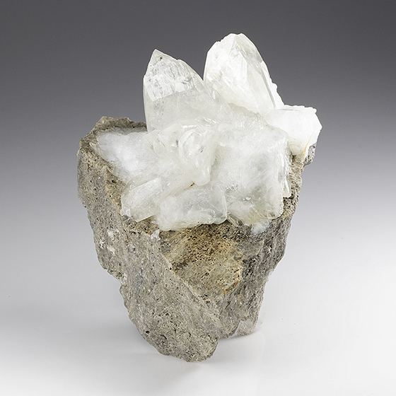 Glassy translucent to transparent colorless scalenohedral calcite crystals to almost 4.0 cm in size coming off matrix. This is in good condition. Very nice for this locality.Data last checked on 11th Aug 2021 - specimen may no longer be available