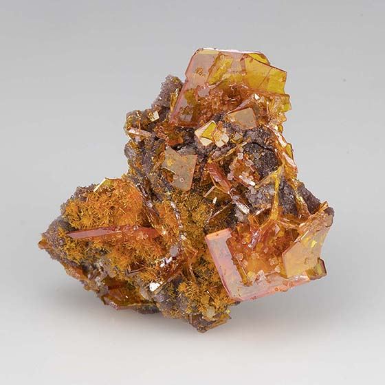 Beautiful orange thin gem crystals of platy wulfenite to 0.8 cm in size on matrix with orange micro crystallized mimetite and minor fluorite. Micro-chipping present but sparse.Data last checked on 11th Aug 2021 - specimen may no longer be available