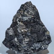 Metallic crystals of fizelyite quite rich across the front of this sphalerite crystal matrix with smaller platy crystals of semseyite. Classic material for this locality.Data last checked on 11th Aug 2021 - specimen may no longer be available