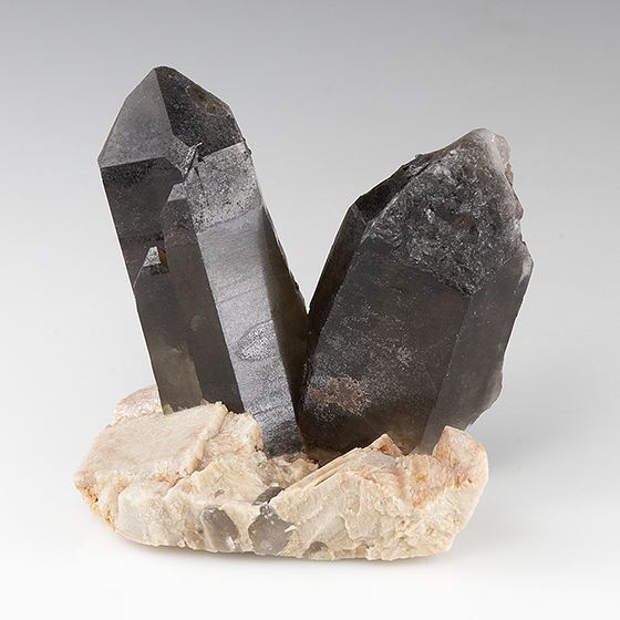 Aesthetic specimen showing two translucent smoky quartz crystals to almost 3.0 cm in height coming off pinkish microcline crystals. Shows well all around and in very good condition.Data last checked on 11th Aug 2021 - specimen may no longer be available
